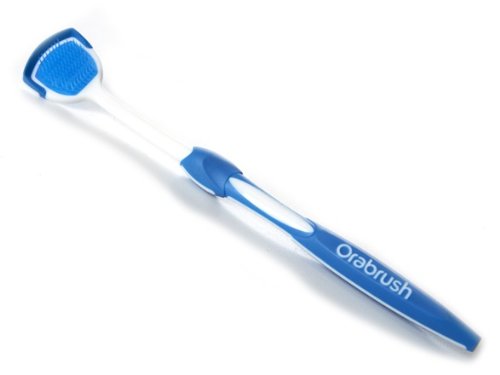 Instructions: 1. Moisten the Orabrush with water 2. Extend your tongue 3. Gently BRUSH back and forth several times cleaning the entire tongue surface 4. Reach the SCRAPER towards the back of your tongue and gently scrape forward collecting the gunk generated from brushing (do not press too firmly, you may damage tongue tissue) 5. Rinse the brush with warm water