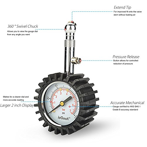 - 4, 360 Degree Swivel Chuck - allow you to view the gauge dial clearly from any angle; Extended Tip - for improved fit onto the vaive stem without leaking air.