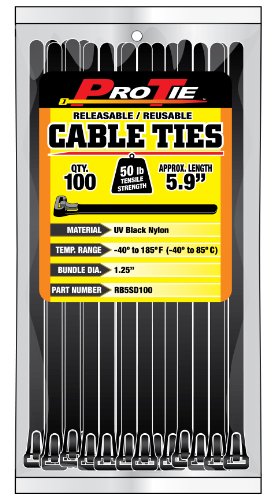 Pro Tie RB5SD100 5.9-Inch Releasable Standard Duty Cable Tie, UV Black Nylon, 100-Pack