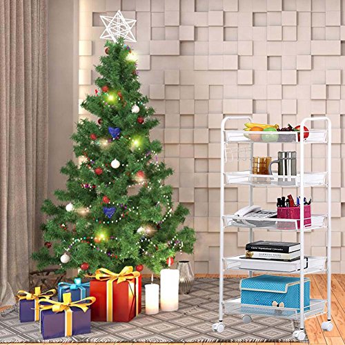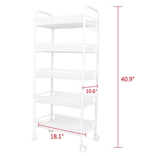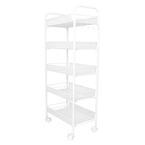 Studio : MALLOFUSA Publisher : MALLOFUSA Product Description Specification: Material: Iron ABS Dimension: 46 x 27 x 104 cm / 18.1 x 10.6 x 41' (LxWxH) Hanger Size: 22 x 10.5 cm / 8.7 x 4.1' (LxW) Each Bracket Size: 41 x 26.5 x 5.5 cm / 16.1 x 10.4 x 2.2' (WxDxH) Each Bracket Weight Capacity: 10 Kg / 22.05 Lb Distance between Brackets: 14.5 cm / 5.7'; 15 cm / 5.9'; 14.5 cm / 5.7'; 15 cm / 5.9' Wheel Dia.: 4 cm / 1.57' Ground Clearance: 8.5 cm / 3.35' G.W.: 4.5 Kg / 9.9 Lb Features: The 5-tiered wire storage rack makes storage easy. The items at your kitchen, garage, living room, etc, can be remained well organized while only a little space is occupied. 5 Tier rack and 5 additional hooks on the side rail helps, offers much space for utility storage 4 casters on the bottom allow the shelf to be moved around. The brake on the caster helps lock the cart when it needs to be stable. Package includes: 1 x Metal Shelving Unit Cart 0