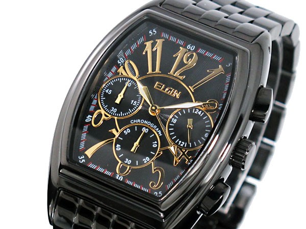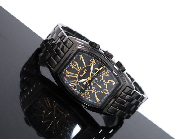 アメリカ陸軍の公式時計にも採用された技術力と歴史を誇るエルジンのクロノグラフ腕時計。上質かつ繊細な雰囲気です。裏側(ケース裏蓋)を三次元的に歪曲させ、腕にしっくりと馴染むトノー形(樽型)デザイン。プレゼントやギフトにもおすすめ。