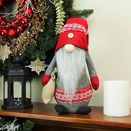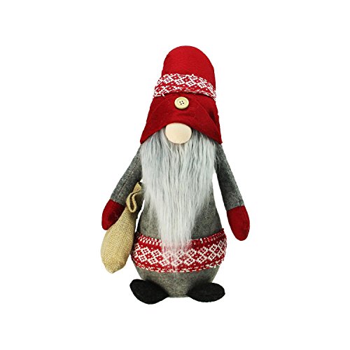 Studio : Northlight Publisher : Northlight Binding : Kitchen Product Description Gnomes are best known for guarding Earthly treasures and are perfect for protecting your Christmas goodies This adorable gnome is dressed in gray, with a red and white knit Nordic sash and red mittens His Very tall, trademark, red hat is pulled over his eyes, trimmed in a Nordic knit pattern and finished with a wooden button This gnome is carrying a burlap sack that he carefully guards The long, gray beard and bulbous nose are well known traits of the cunning gnome Has a weighted bottom to keep gnome upright Bendable wire in the hat and arms for easy positioning Dimensions: 29.5"H x 8"W x 6"D Material(s): fabric/wire/plastic beads/burlap 0