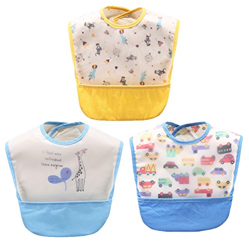 -. Feature : KEEP MEALTIMES MESS-FREE - There's no denying that having a baby is messy business. From those endless milk feeds to dreaded teething and the fun of weaning, a bib is an essential item for any new mum to help ease the pressure on the washing machine. Keep mealtimes as mess-free as possible (not easy, we know) with a well-designed cover-up is our mission. / TWO LAYERS TWO USES - Our baby bib have two layers. Outside layer is made of EVA resin and inside layer is made of cotton. You can use it as a normal baby bib to prevent drool from wetting your little one's outfit. Another use is turn over the small pocket to the front side as a catch-all pocket, it is great at containing spills and reducing loads of laundry. / EASY TO WIPE - Due to outside layer is made of EVA, which means it is like a waterproof coating on inside layer. So you do not need to wash it every time after using. Just wipe outsider layer softly is ok, and then you can use it again at once without waiting to dry. / ADJUSTABLE VELCRO CLOSURE - They feature an adjustable Velcro closure, allowing you to get the best tug-proof fit for your little one. Our bibs are lightweight and easy wipe, making them both comfortable and durable. Our bibs are designed to withstand wash after wash. Simply machine wash warm and hang dry thoroughly before storing. / SIZE (APPROX.) - Length is 25cm/9.8in. Width is 21.5cm/8.5in. Width of pocket is 8.5cm/3.3in. Suitable for 1-3 years old baby. 3 packs of set are 1 Blue Giraffe + 1 Yellow Cartoon + 1 Blue Car, in total 3 baby bibs.