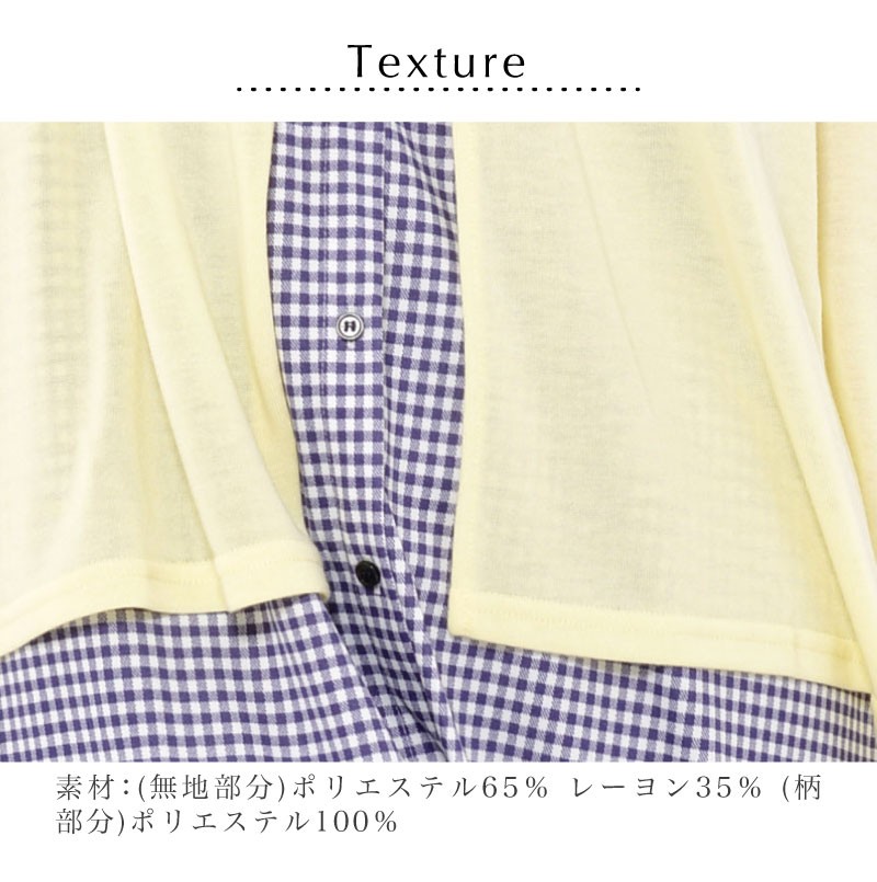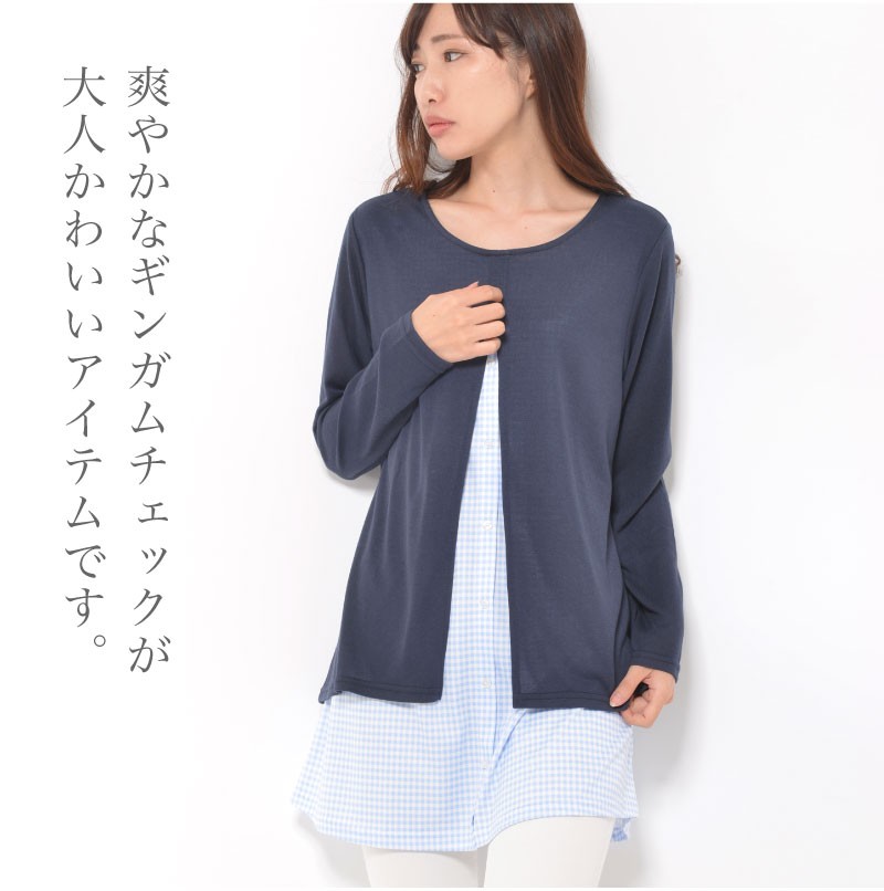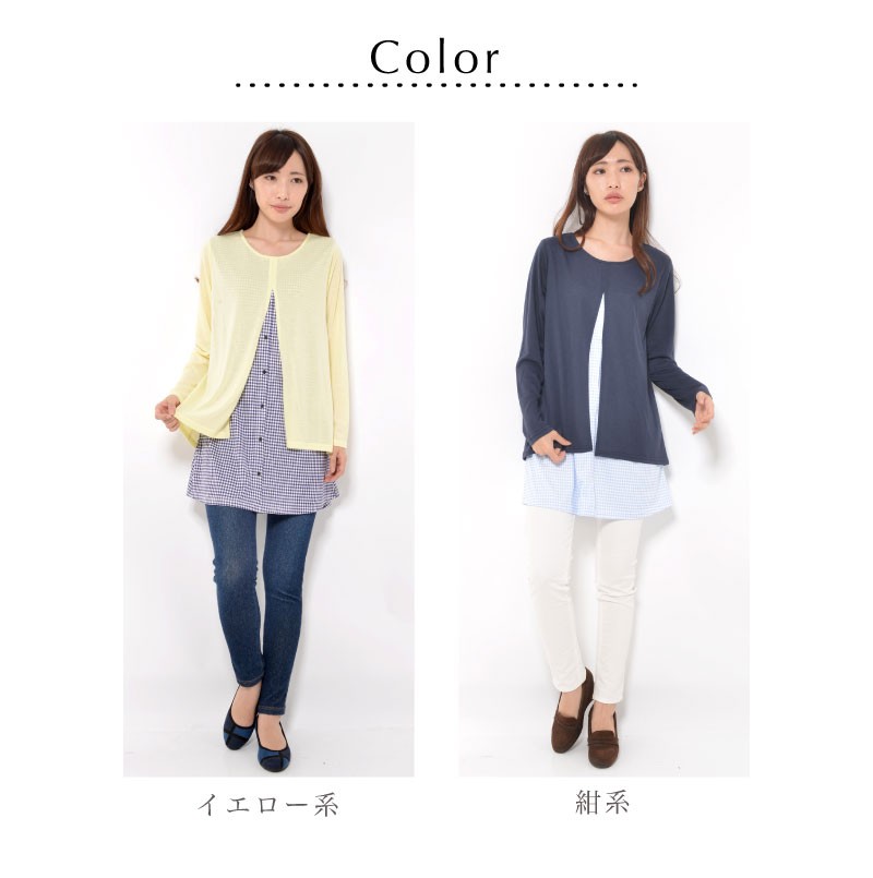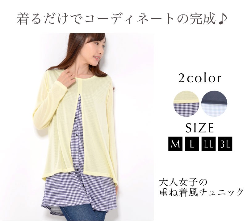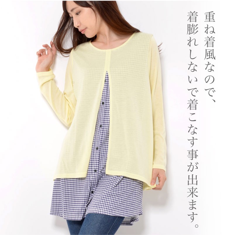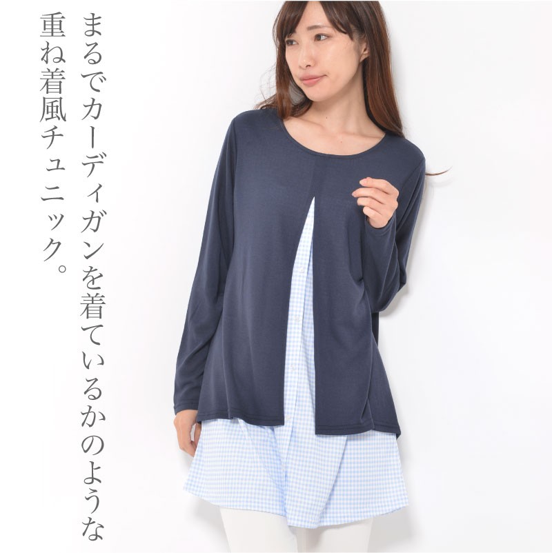 大人女子の重ね着風チュニック。まるでカーディガンを着ているかのような重ね着風チュニック。