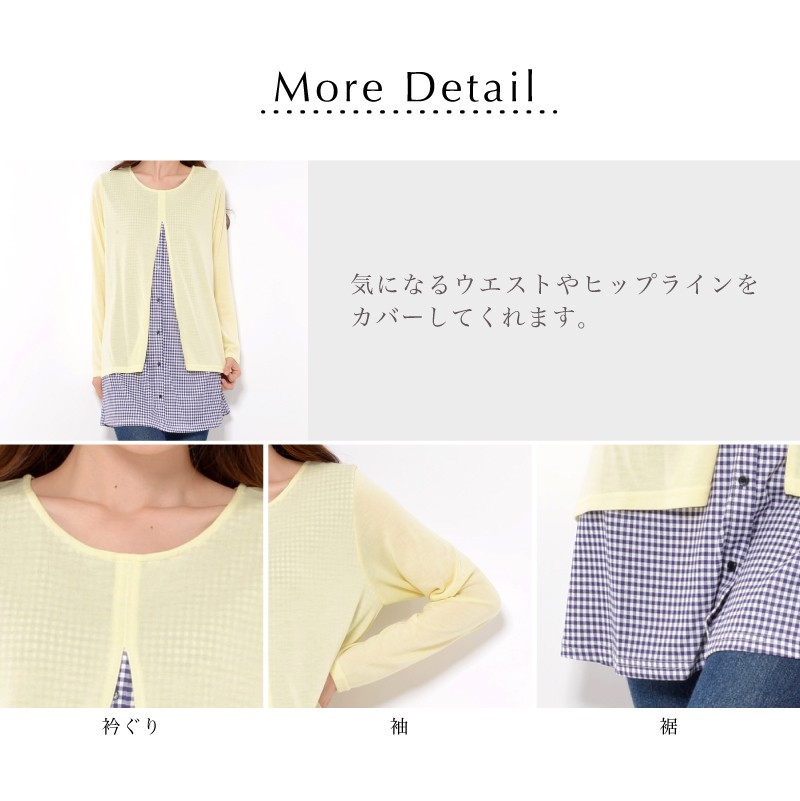 重ね着風なので、着膨れしないで着こなす事が出来ます。ややAラインで、後ろ身頃が長いので、気になるウエストやヒップラインを体型をカバーしてくれます。
