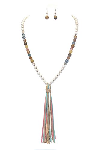 This 30 inch necklace is comprised of marbled finish light cream color beads that measure ¼ inch in diameter, transparent faceted glass beads in light blue and pink, honey iridescent, aurora borealis glass beads, and light peach color translucent beads and round cut variegated stone beads, culminating in a faux-suede and silky cord tassel in beige, cream, pink and light blue.that measures approximately 5 ½ inches in length.An additional 3 inches of wearable length is available via extender chain.
