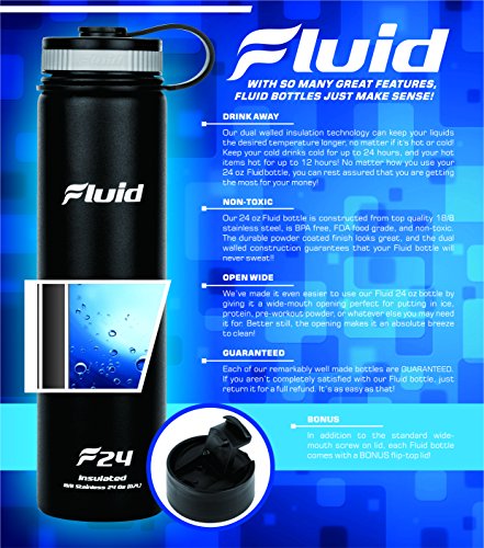 ★ DRINK AWAY– FLUID brings even more to the table with our wide-mouthed 24 ounce Insulated Water Bottle! This is a must have thermos for those that want their favorite drink with them at all times! With our dual walled insulation, we can keep your liquids at the desired temperature longer, no matter if it’s hot or cold!