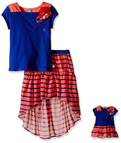 Dollie & Me knit color block top with chiffon stripe hi-low skirt and matching doll outfit