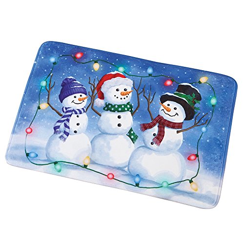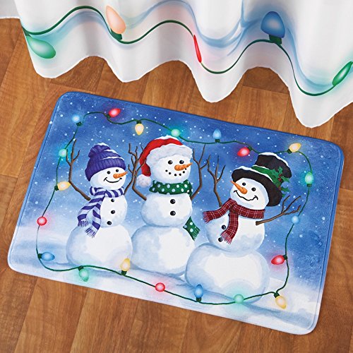 Studio : Collections Etc Publisher : Collections Etc Product Description Snowman Trio Christmas Bath Mat Description Bright and colorful bath mat features a snowman family dressed in cute hats and scarves against a snowy background. A string of multicolor holiday lights surround the charming scene. Skid-resistant backing. Hand wash. Polyester, plastic and foam; imported. 29 1/2" x 19 1/2". Shop Coordinating Items [ TIP: Type the product name and item # into the search box ] - Snowmen Trio Toilet Tattoo Decal Christmas Decoration (Item #40686)