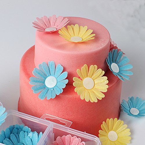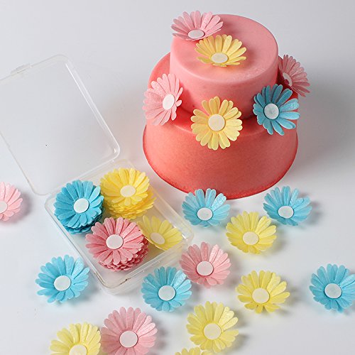 SIZE & MATERIAL: The 12 edible Flowers are 2",mixed by six colors. Color of flower as the picture.It is made by edible rice paper which is made by starch.