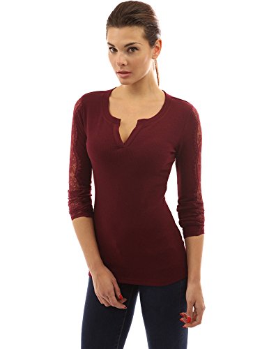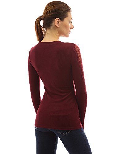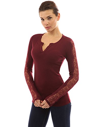 PattyBoutik Notch Neck Lace Inset Long Sleeve Ribbed Top. Model in pictures is 5 feet 8 inches (173cm) tall wearing size S.