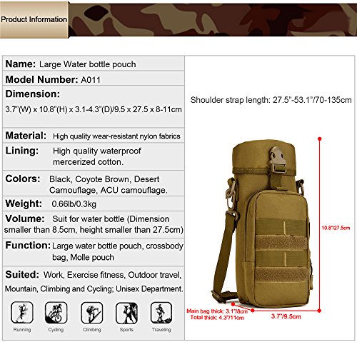 -. Feature : Suit for ≤800 ml water bottle, Dimensions: 3.7" W x 10.8" H ,Shoulder Max Straps 53.15".' / High strength and durable nylon ripstop fabric, scratch resistant,and not easy to fade after long-term use, and wear resistance higher 10 times than conventional polyester fabric tension / Connection with the MOLLE system, you can easily use with the load on the large package, make your backpack more personalized and practical, but also can be hung on a belt / High intensity snaps, durable, can be used with other PALS harness as a combination of the MOLLE system / Shoulder strap can be removed, you can put it on the left or right shoulder .Buckle can rotate 360 degrees, self-adjusting to the most approP.R.Iate angle, more personal durable