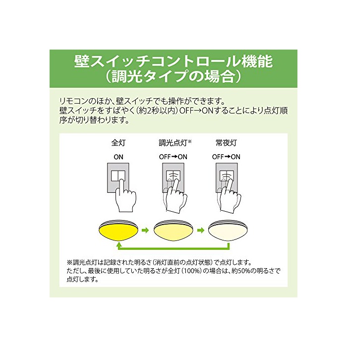 리모콘:【전등상야등OFF】조빛: 연속조광(100%~약10%)고, 다단조빛(100% 약70% 약50% 약30% 약10%)고, LED상야등(7단계조광)고, 멸,고, 벽스위치 콘트롤(전등,메모리조 광점등,상야등)벽스위치로 민첩하게(약2 초이내)에서 OFF→ON 하는 것(일)에 보다 점등 순서가 잘라 교체고 있습니다.