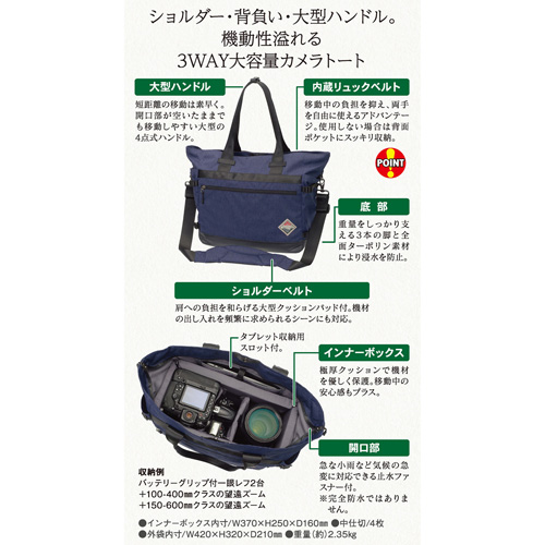 ●ショルダー・大型ハンドル・背負、機動力溢れる大容量3wayカメラトートバッグ。