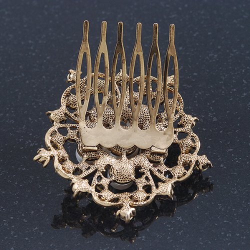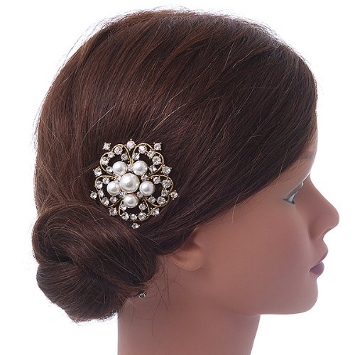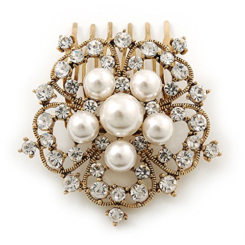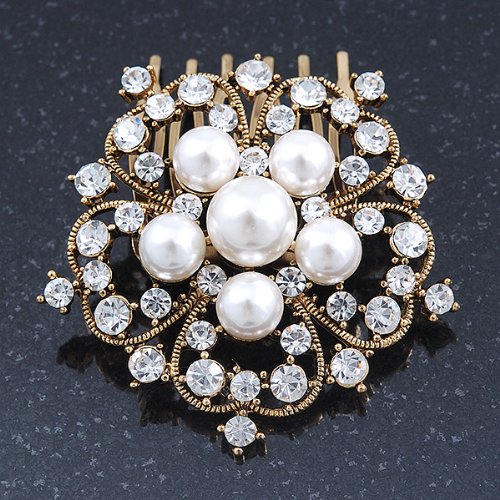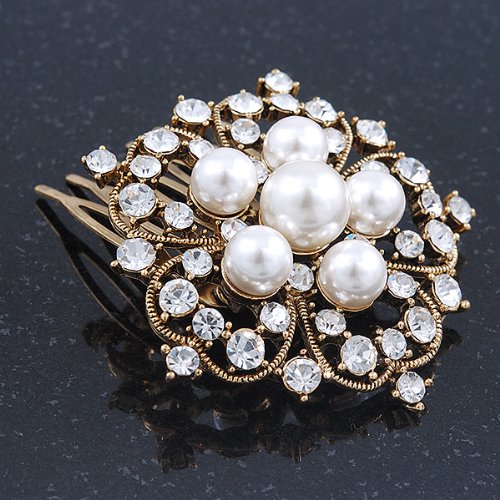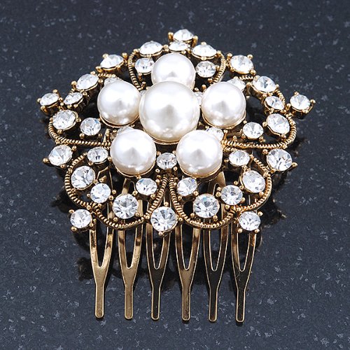 -. Title : Bridal/ Wedding/ Prom/ Party Antique Gold Tone Austrian Clear Crystal, Synthetic Pearl 'Open Flower' Hair Comb - 55mm