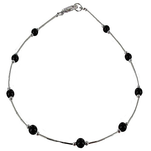-. Title : Womens Black Onyx & Sterling Silver Tube Ladies Beaded Gemstone Anklet with Daisies