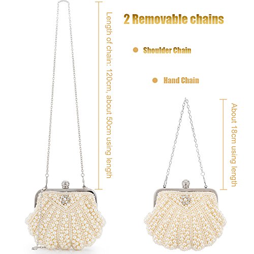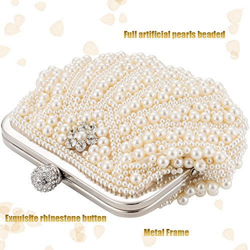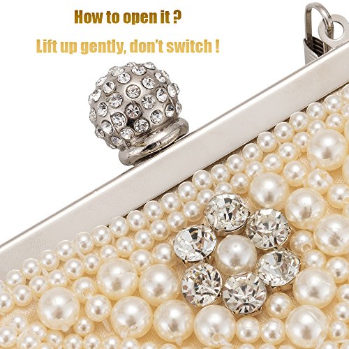 - 1. MATERIAL: Full of artificial mellow pearls, strong metal frame, satin interior lining.