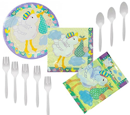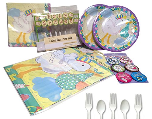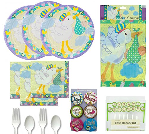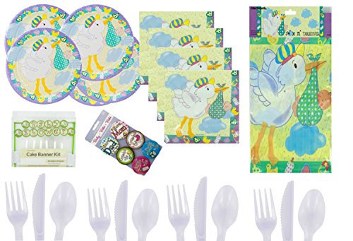 -. Title : Stork Baby Shower Kit for 16 - Plates, Napkins, Cutlery, Cake Topper, Tablecloth, Candles, Button Pins - Babyshower for Girls or Boys Bundle, Decorations & Party Supplies