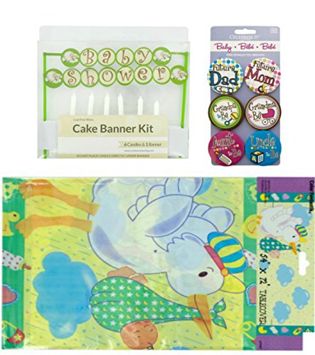 -. Feature : BABY SHOWER DECORATIONS FOR GIRL - 16 piece Stork Baby Shower Party Plates (approx. 7"), 16 piece baby shower 2-ply luncheon baby shower napkins / BABY SHOWER DECORATIONS FOR BOY - Plan a unique and memorable baby shower that people talk about for years to come. / BABY DECORATIONS FOR BABY SHOWER - 1 Stork's SurP.R.Ise Plastic Baby Shower Tablecover (approx. 54" x 72") / DIAPER SHOWER, GRANDMA BABY SHOWER - 6 piece fun Baby Shower Pins Set for family members (approx. 1.75") / BABY SHOWER DECORATIONS - 7 piece Baby Shower Cake Banner & Candles Kit (approx. 2.5" long and banner is 6.25") & 16 piece white/clear plastic cutlery set - spoons, knives & forks