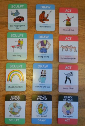 Studio : Funhala Publisher : Funhala Binding : Toy Product Description For ages 18 . This irreverent party game combines the fun of Cards Against Humanity with the mechanics of charades and Cranium. Act, draw, or sculpt with playdoh the phrase to win the card. First team to 3 cards of each category wins. Plahdoh not included with Krackades Mini. Note: Cards Against Humanity and Cranium are distinct games sold by different companies (Cards Against Humanity LLC and Hasbro, respectively) We are not related to either of them. Plahdoh is manufactured by Hasbro and can be bought in most retailers such as Target or Walmart. 0