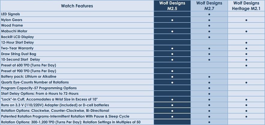 The module 2.7 makes an ideal companion for self-winding watches because it simulates your wrist action, rotating the timepiece as if it were being worn and keeping it wound and ready to wear at a moment’s notice. The module 2.7 provides rotation setting options from 300 to 1200 rotations with double the tpd (turns per day) if set bi-directional. The pre-programmed rest and sleep phases allow the mainspring an opportunity to release its stored energy with a nominal amount of energy being spent, keeping the focus on reliability. This meridian single watch winder features a sturdy wood construction frame, a smooth black piano finish exterior, a black textured silk faceplate, shiny chrome hardware and is powered by a 3v adapter (included). Wolf Designs Watch Winder Comparison  0 |