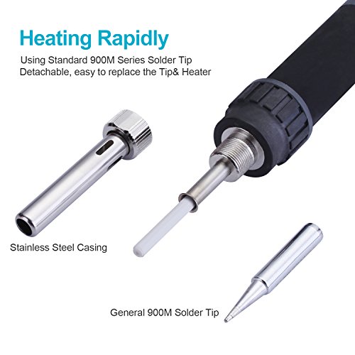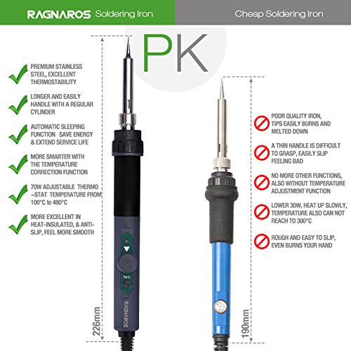 - FUNCTIONAL DESIGN HIGHLIGHTS: this 70W 110V soldering iron is designed with ON/OFF switch control, works at adjustable thermostat temperature from 100°C to 480°C, fitting most universal soldering needs; featured with temperature correction function and LED indicator light, which means you can reset when the heater tip is error with the set temperature; Moreover, the automatic sleeping function will help to save lots of energy and extend its service life.