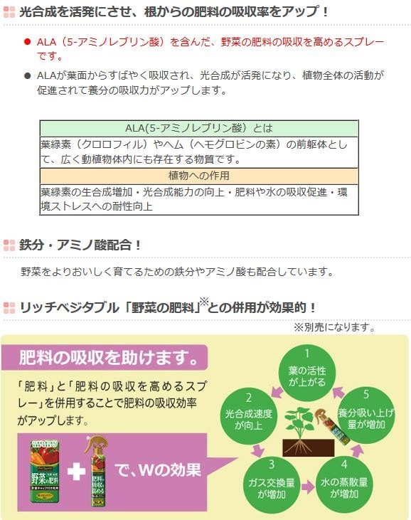 | 葉緑素の元であるALA(5-アミノレブリン酸)を配合しているので、光合成能力を向上させ、肥料の吸収が促進されます。葉に直接スプレーすることで、根から吸収しにくい微量元素をしっかり吸収させます。 |