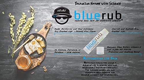 BLUERUB Moisturizing Lip Balm is soothing relief... Not too creamy - Not too firm, just right... Our specially formulated lip balms hold true to our core beliefs - They provide protection and soothing relief without petroleum or silicone products. Infused with responsibly harvested Beeswax to condition skin with Jojoba Oil to improve and relieve chapped and sunburn lips. BLUERUB adds Vitamin E to moisturize and nourish dry lips while keeping them revitalized and hydrated. BLUERUB Lip Balms have a matte finish and moisturizing feel unlike the petroleum products that leave you lips dry and burning, forcing you to reapply hourly. You will find that this tube of soothing lip balm glides on smoothly and will last longer than the other brands because your lips become moisturized and hydrated. If you enjoy winter skiing or fun in the sun, your lips will be prone to wind or sun damage. Having our 100% Natural or SPF-15 Lip Balm in your coat, purse, or gym bag means you have the protection needed against the elements. Because BLUERUB is Beeswax based, our Lip Balm creates a layer of protection against wind, snow, and sun. This 100% natural beauty product is free of parabens, phthalates, petrolatum and SLS and will beautify and revitalize your lips. Use this natural BLUERUB Moisturizing Lip Balm to make your lips feel replenished. Once you try bluerub lip balm, you may never go back! 100% natural and never tested on animals!Feature