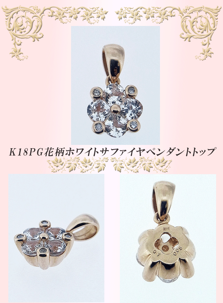 0.7cホワイトサファイヤで花びらをモチーフしたK18ピンクゴールドのペンダントトップです。0.05ct天然ダイヤモンドが4隅で輝きを添えています。