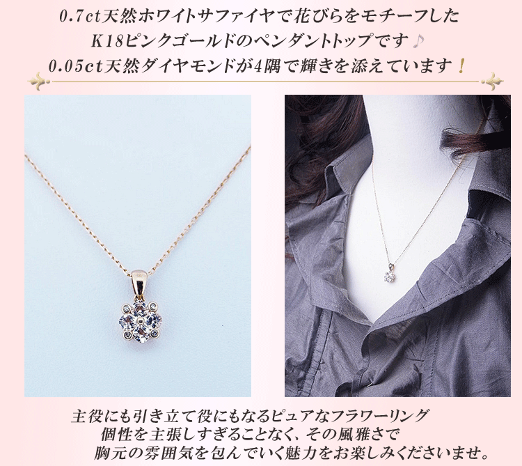 商品説明 0.7cホワイトサファイヤで花びらをモチーフしたK18ピンクゴールドのペンダントトップです。0.05ct天然ダイヤモンドが4隅で輝きを添えています。