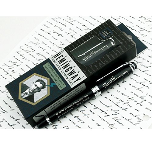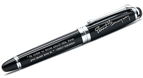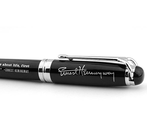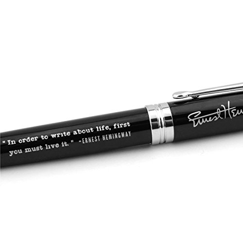 -. Feature : Ernest Hemingway quote pen, engraved with Ernest Hemingway's signature and quote / Quote reads, "IN ORDER TO WRITE ABOUT LIFE, FIRST YOU MUST LIVE IT." - Ernest Hemingway / Elegant and durable, this pen weighs approximately 55 gm, and measures approximately 5.5" long / Roller ball writing tip with black ink; Easy-to-replace ink cartridge / Makes a suitable gift for any writer, editor, teacher, or Ernest Hemingway fan!