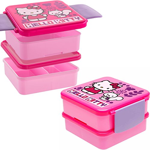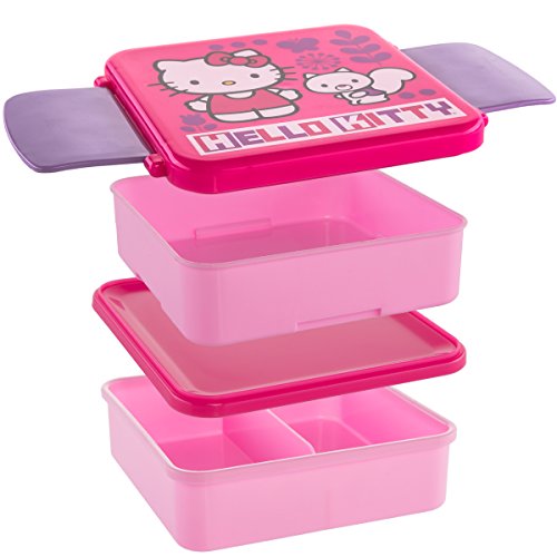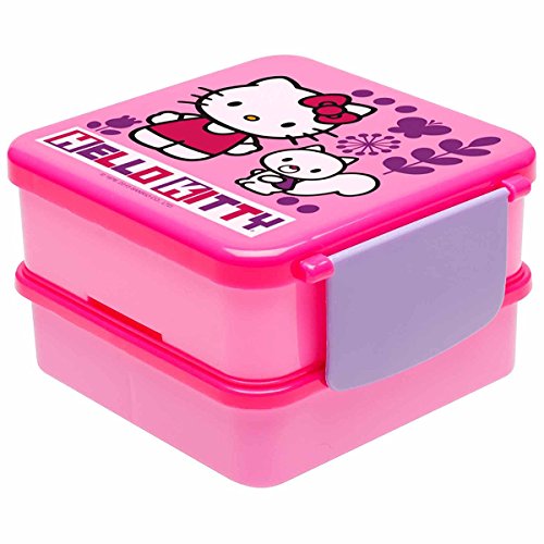 - This hello kitty lunch box is a portable, stackable mealtime storage pack set; 1 single & 1 divided section, each with snap lid; Stack together & latch w/flaps or use separately; Cute cartoon image of Hello Kitty & Rorry squirrel; Pink translucent plastic w/hinged lid & latch