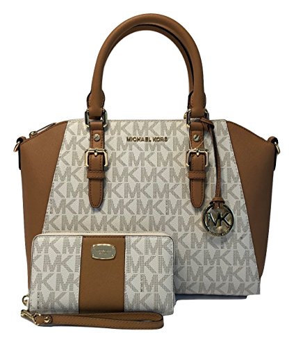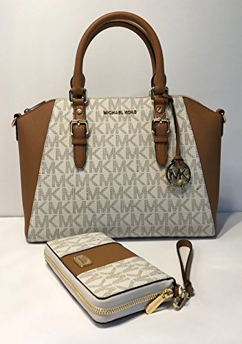 Bundle of 2 items: MICHAEL Michael Kors Ciara Large TZ Satchel bundled with Michael Kors Jet Set Travel Large Phone Wallet Wristlet (Signature MK Vanilla Acorn/Center Stripe)