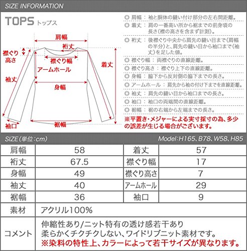 -. Feature : 素材 アクリル100% / コメント 伸縮性若干あり/ニット特有の透け感若干あり 柔らかくチクチクしない、ワイドリブニット素材です。 ※染料の特性上、カラーによって若干サイズが異なります。 / サイズ 肩幅:58cm 着丈:57cm 裄丈:67.5cm 襟ぐり幅:17cm 身幅:49cm 襟ぐり高さ:7cm 袖丈:40cm アームホール:29cm 裾幅:36cm 袖口:9cm スヌード:幅40cm 周囲60cm