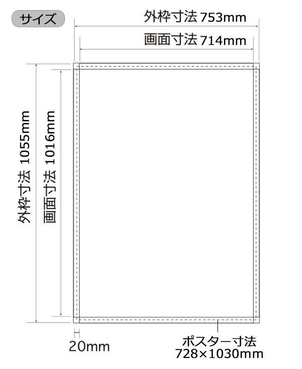| 仕様 | 屋内仕様 フレーム幅:20mm フレーム厚み:24mm 画面寸法:W714×H1016mm ポスター寸法:W728×H1030mm 掲示物の厚さ:7mmまで対応(規格品) |