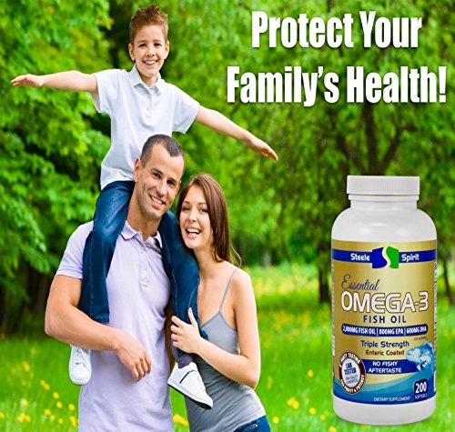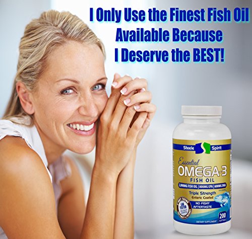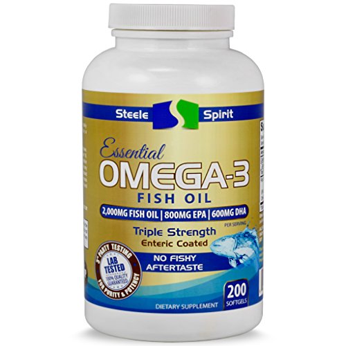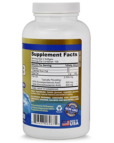 -. Feature : 100 Servings of the Purest, 3rd Party Lab Tested Fish Oil guaranteeing Ingredient Safety & Potency. / 2,000 mg Fish Oil, 1400 mg Omega-3 Fatty Acids (600 mg DHA, 800 mg EPA) per serving. / The perfect formula, exceeding expert recommended daily minimum of 500 mg EPA+DHA / Enteric coated so NO Fishy aftertaste or Burps. / Supports heart and brain health, immune system, joints, mood & mental state, skin and hair.