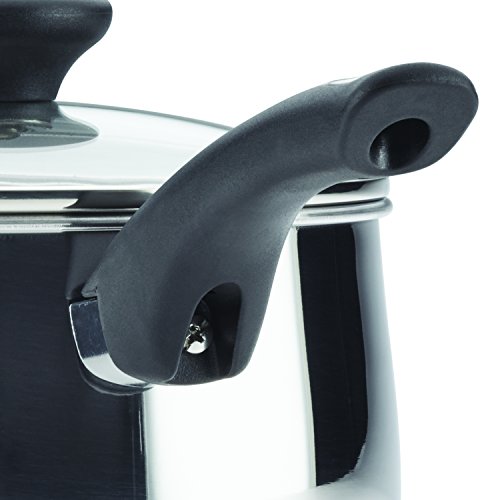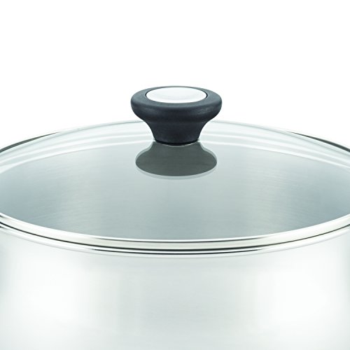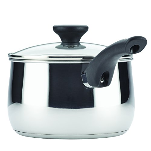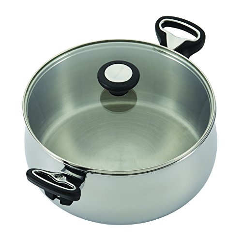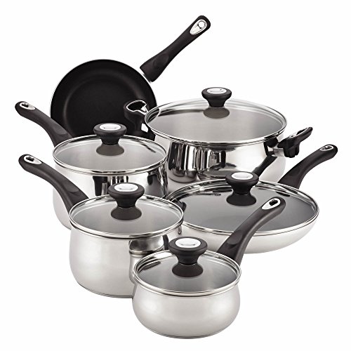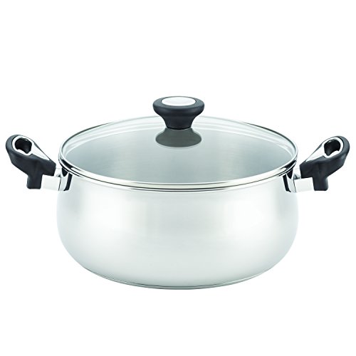 • The Farberware stainless steel cookware set features bell-shaped, mirror-polished construction that is dishwasher safe