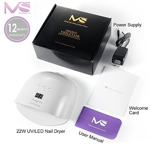 Studio : MelodySusie Publisher : MelodySusie Binding : Misc. Product Description MelodySusie - Bring Your Beauty Salon Home! VIOLETAIR Nail Dryer - Bring a Professional Manicurist Home! Product Highlights: MelodySusie Violet Series - VIOLETAIR Pro 22W Smart Gel Nail Dryer is built with the newest cutting edge lamp technology. So it can cure both UV and LED gel nail polish efficiently with shorter time. At the same time, it can keep your beautiful manicure strong and lasts up to three weeks. With the preset timer functions, you can choose the time exactly as you need. And the design of automatic sensor is also convenient for you to stop the curing process in any times. Product Details: Color: White Power: 22W Input: 100V-240V AC, 50/60Hz Output: DC-12V 4A LED: 15PCS LED N.W: 0.69 lb Size: 7.5*7.5*3.2 inches Please Note Before You Purchase: 1. Please make sure your gel polish works with this product. If not compatible, gel will not get dried and might start peeling and cracking. This Smart nail dryer can work with Most LED and UV Gel polish.