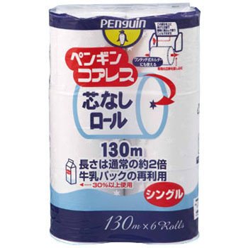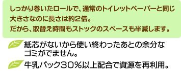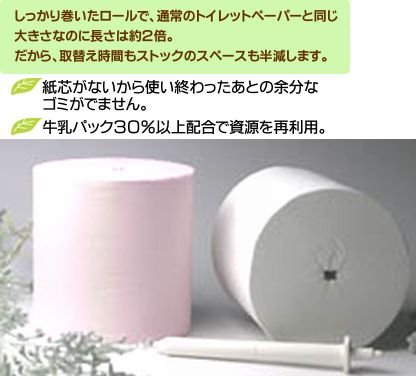 It is a coreless roll whose length of winding is 130 meters and the replacement frequency and the space of the shopping pool are halved.