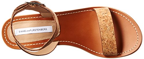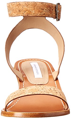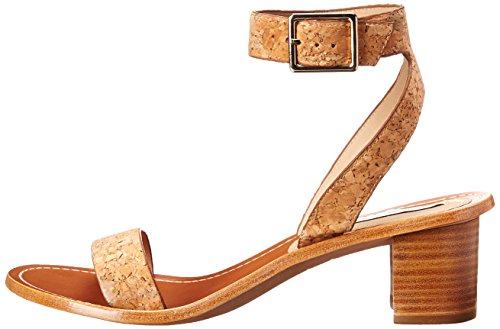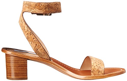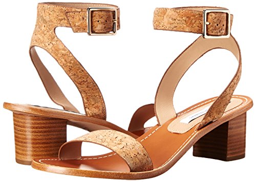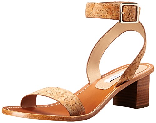 Stacked-heel sandal featuring leather or cork straps and metallic buckle at ankle