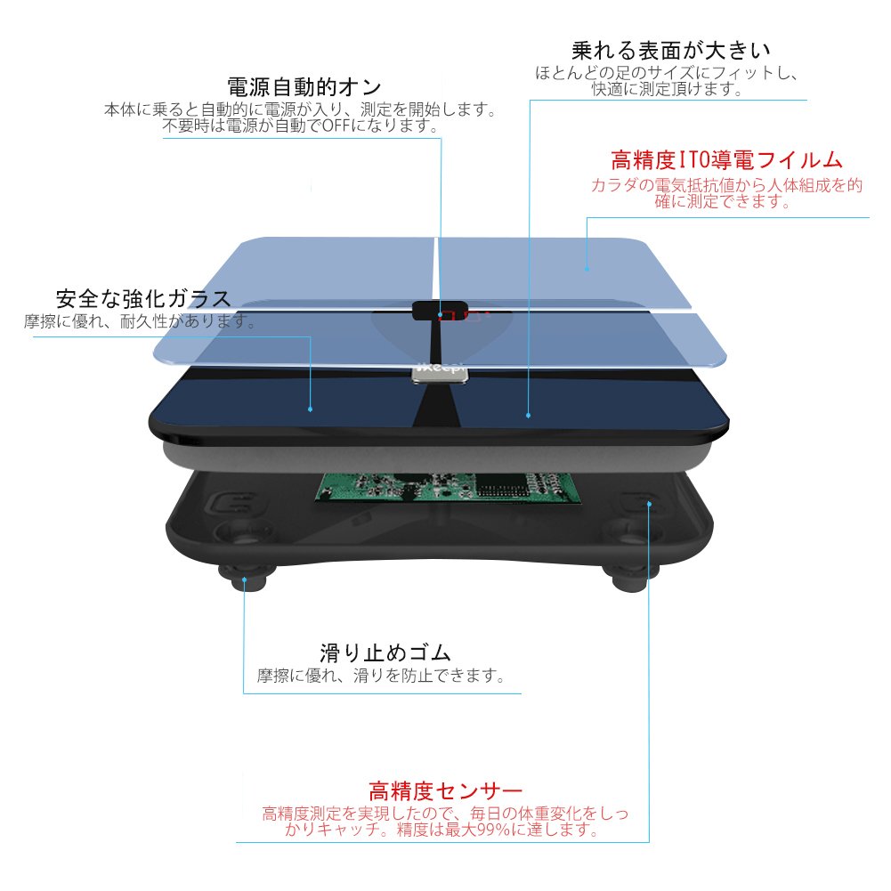* In cooperation with the health management application "New iWellness", various items ranging from weight and body fat percentage to muscle mass, basal metabolism rate, body moisture content, visceral fat level, BMI, estimated bone mass