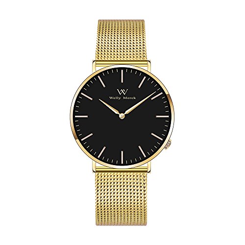 -. Feature : Every Welly Merck watch is outfitted with a Ronda 762 quartz movement. Sapphire Crystal Glass make the watch hard and durable. Stainless Steel 18mm Width IP Plating Mesh Strap. 36mm Diameter and 6mm Thickness stainless steel case. 5 ATM water resistant. / 4 O'clock Crown Design and super thin, according to Ergonomic Theory and based on the Consultation from countless horologists and stylists, ensure you feel comfortable to wear.Innovative interchangeable strap that can change the look of the watch in just a few seconds without a tool. / Classic, Stylish, Minimalist signature styles make Welly Merck Watch deserve a spot in everyone's collection. No matter business, casual, indoor activities or daily use.It's also a tremendous Gift for your family, friend or lover with a special leather package. / Inspired by desire, conceived with passion, and born with quality. Welly Merck watches represent a modern union of quality and fashion that makes luxury watches affordable for almost everyone. / All the WELLYMERCK watches have 2 years warranty.