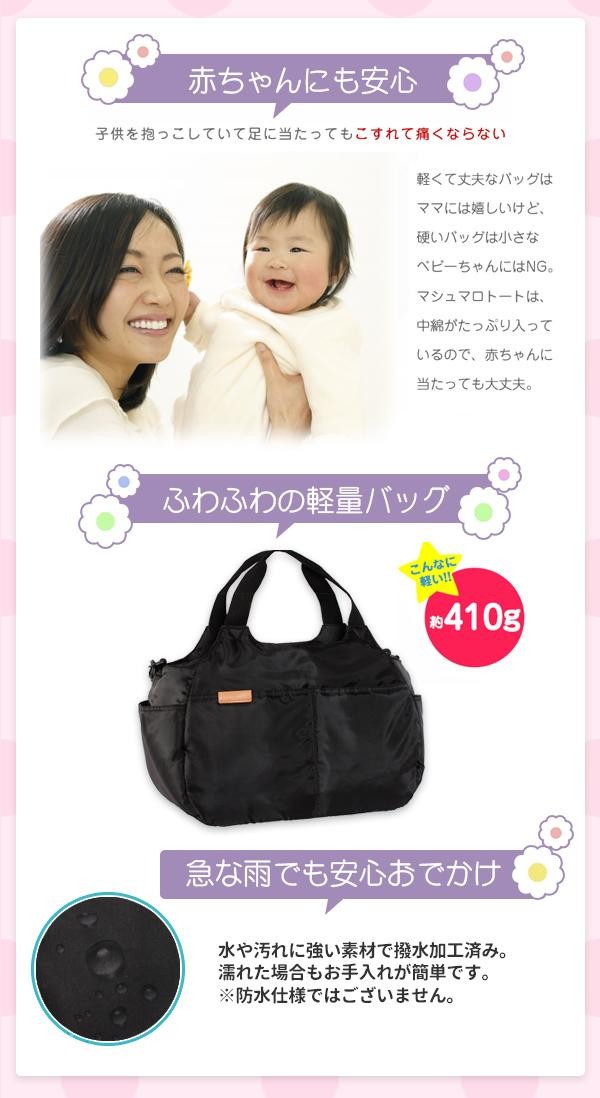 | トートバッグとしてもショルダーバッグとしても使える2WAYマザーズバッグです コンパクトながらお出かけに必要なものをしっかり入れることができる大容量サイズ7つのポケットで収納力バツグン 丈夫で軽いポリエステル素材を使用しているため バッグの重さが気になりません 中綿がたっぷり入っているので 赤ちゃんに当たっても大丈夫 また 撥水加工を施しているので 汚れてもお手入れがカンタンです |