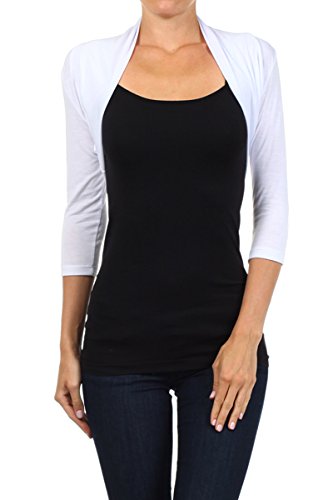 -. Binding : Apparel -. Brand : Modern Kiwi -. Department : womens -. Feature : Rayon with open front and three-quarter sleeves / 95% Rayon 5% Spandex / Made in USA / Dry-clean or hand wash cold / Bust (S) 33-35 inches, (M) 35-37 inches, (L) 38-40 inches -. Model : TBR-GGDD361 -. ProductGroup : Apparel -. ProductTypeName : SWEATER -. Title : Modern Kiwi Solid Long Sleeved Bolero Shrug Top