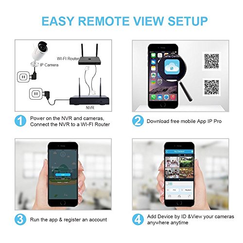 Plug & Play Setup:Charge the NVR and Cameras,Connect Wifi,Download Free APP,Scan Code to Add New Device,View Online Surveillance Video on Smartphone or Display Device with HDMI.Start your Intelligent Life from Now on.Mobile