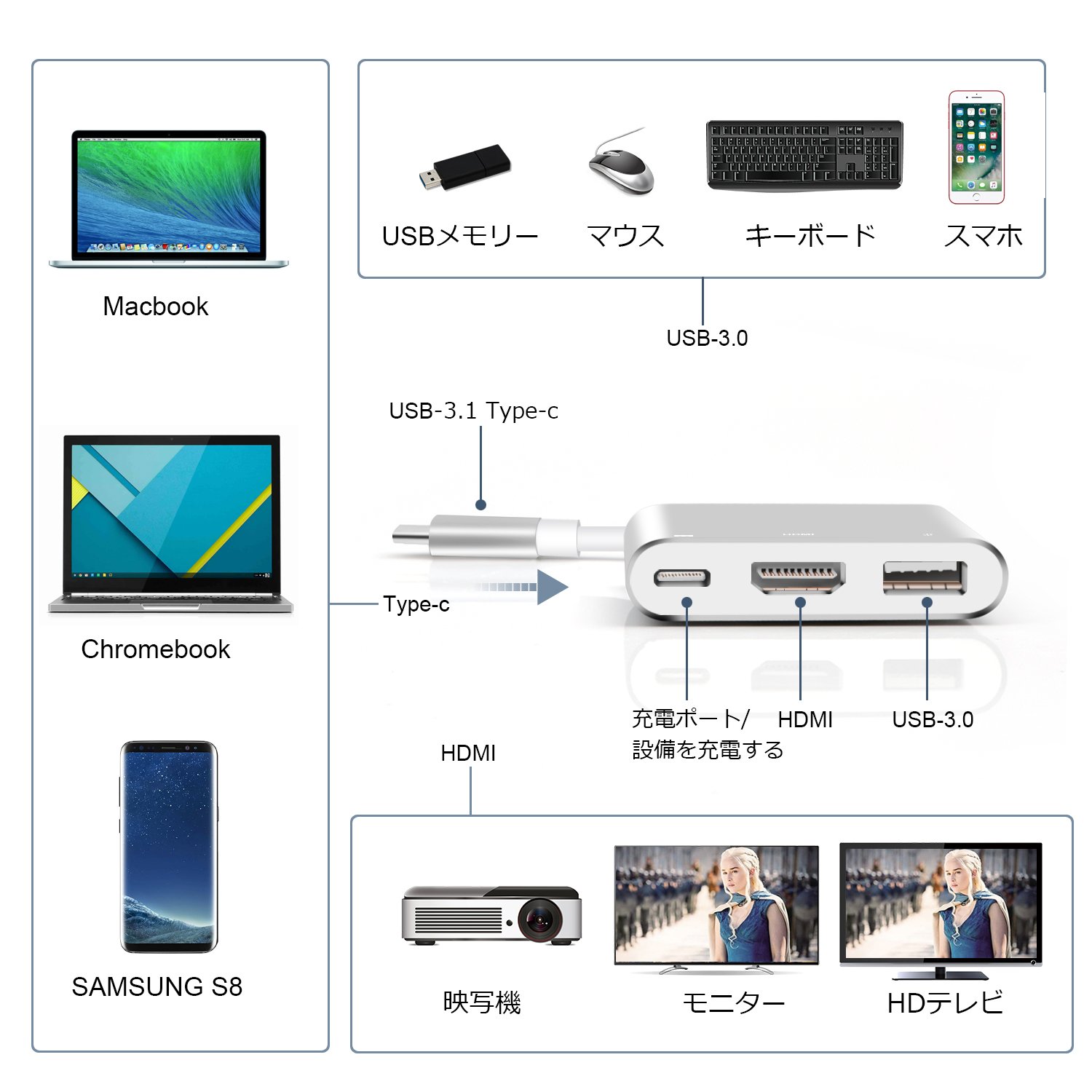 : Connect devices such as keyboard, mouse, HDD, USB flash memory, smartphone, USB cable.