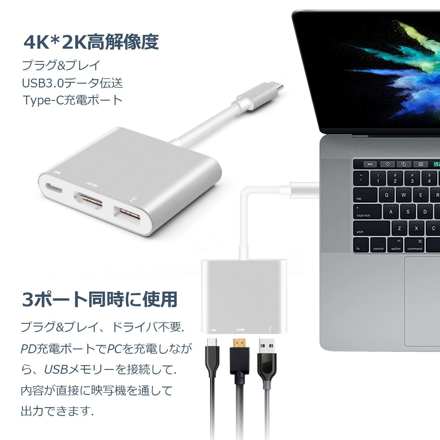USB 3.0 port + HDMI port + USB-C PD charging port