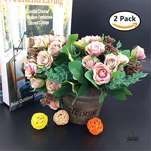 S.Ena, 6 Branch 15 Heads Artificial Silk Fake Flowers Leaf Milan Rose Wedding Floral Home Decor Bouquet Birthday Party DIY, Pack of 2 (Purple+Pink)