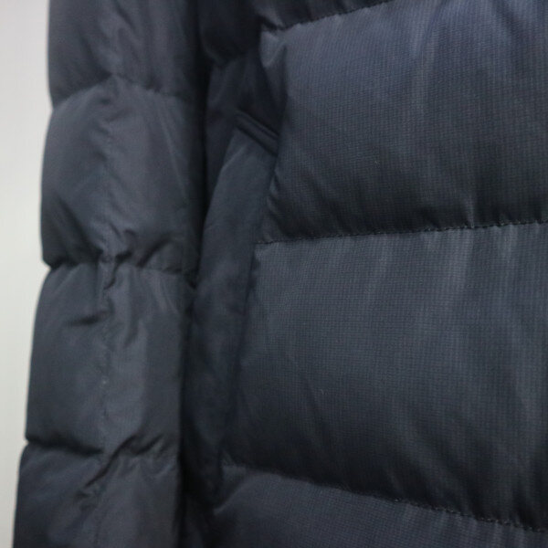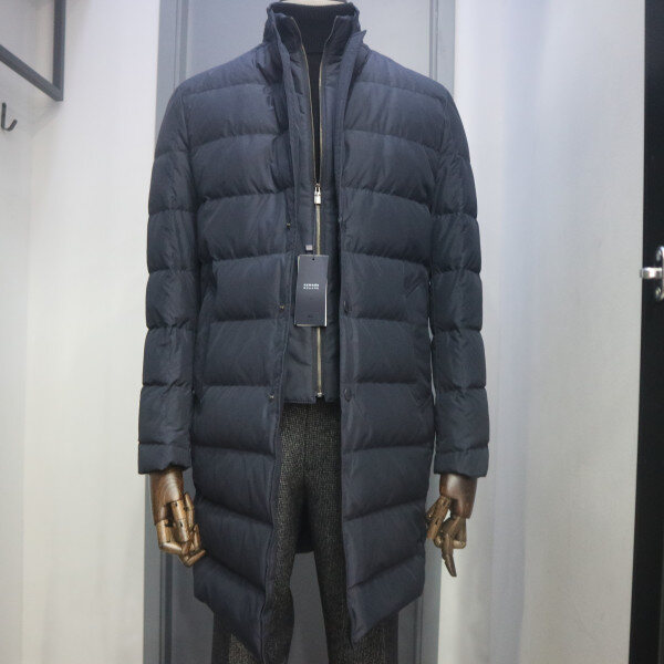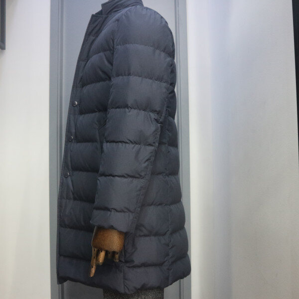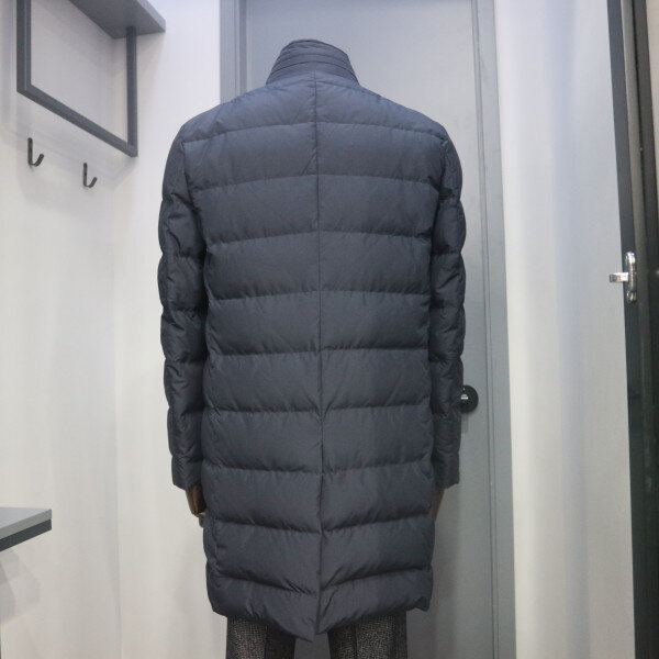 프린트소재의 덕다운 퀼팅 체스터코트로 바람막이와 니트 시보리 사양으로 보온성을 더한 아이템