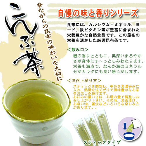 <飲み口> 磯の香りとともに、奥深いまろやか さが身体にす~っとしみわたります。 栄養も満点で、なんか海のミネラル分がカラダにも良い感じがします。 お子様から、おじいちゃん、おばあちゃんまで みんな大好き!昔から愛される癒しのお茶です。 <お召上がり方> スティックを開封し、中身をお湯呑みに入れ、熱湯を注ぐだけで風味豊かなお茶 をお楽しみ頂けます。 お好みの濃いさは、お湯の量で調整しお召し上がり下さい。その他、お茶漬け、お吸い物、雑炊などいろいろな楽しみ方 があります。